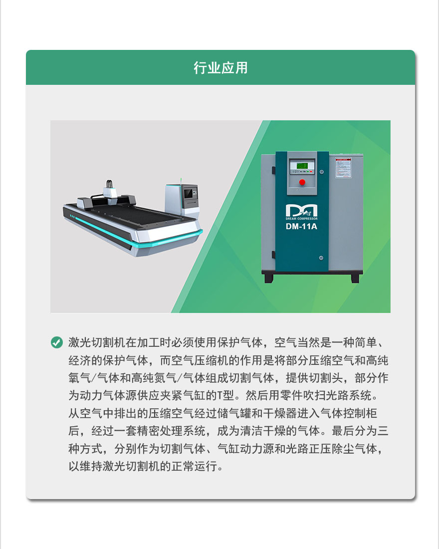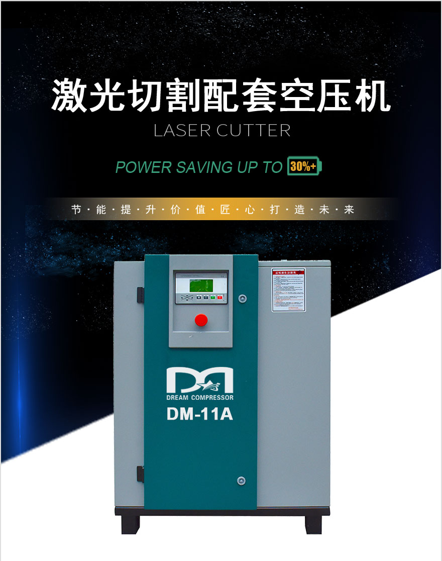 激光切割配套——皮带传动空压机 功率:5~37 KW 排气量:0.48~6.4 M³/min 排气压力:0.8~1.6 Mpa 型号:DM-A型皮带式工频系列