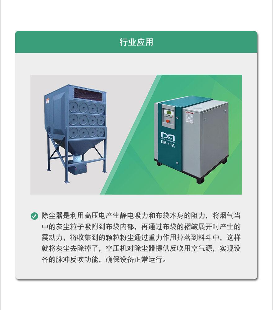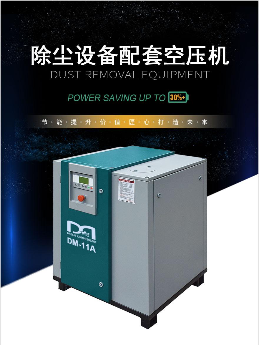 除尘设备配套——皮带传动空压机 功率:5~37 KW 排气量:0.48~6.4 M³/min 排气压力:0.8~1.6 Mpa 型号:DM-A型皮带式工频系列