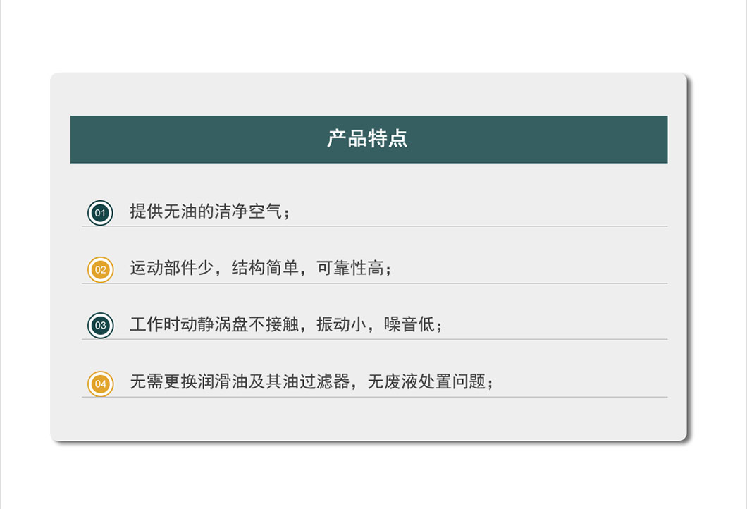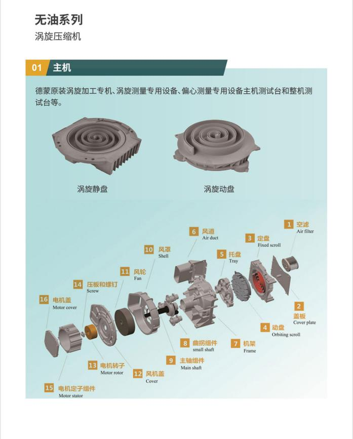 无油涡旋压缩机 功率:0.55~3.0 KW 排气量:0.045~0.260 M³/min 排气压力:0.75 Mpa 型号:DMW45J~260J 无油静音系列 适用行业:无油涡旋压缩机 产品影像